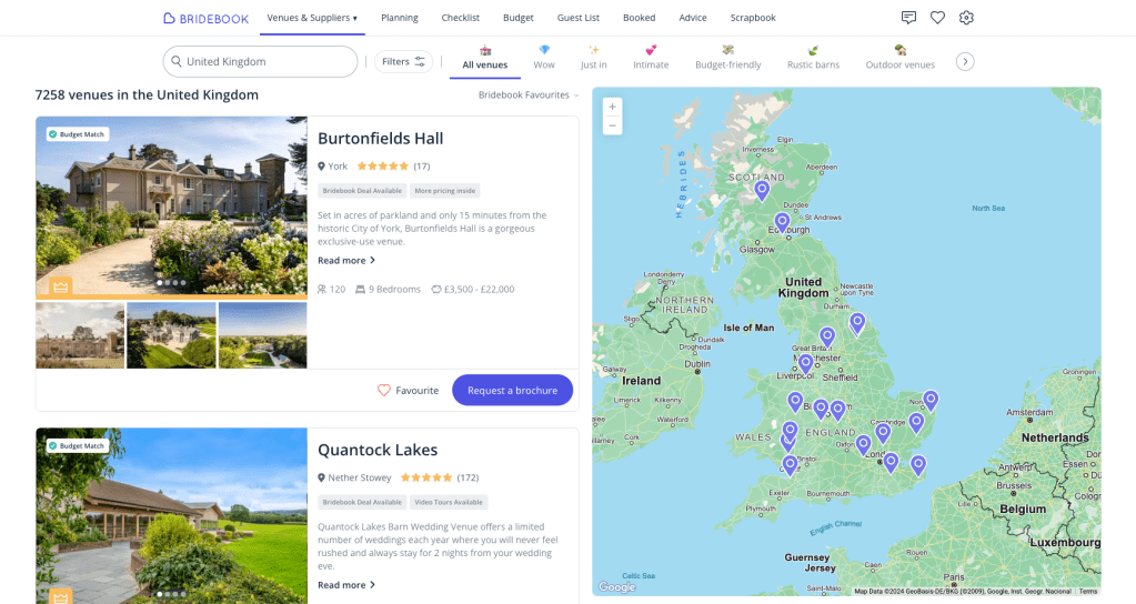 Bridebook’s venue search is like opening a giant box of chocolates: exciting, but you have no idea where to start. The Airbnb-style layout is sleek, and the map feature helps narrow things down, but the filters? Overwhelming.