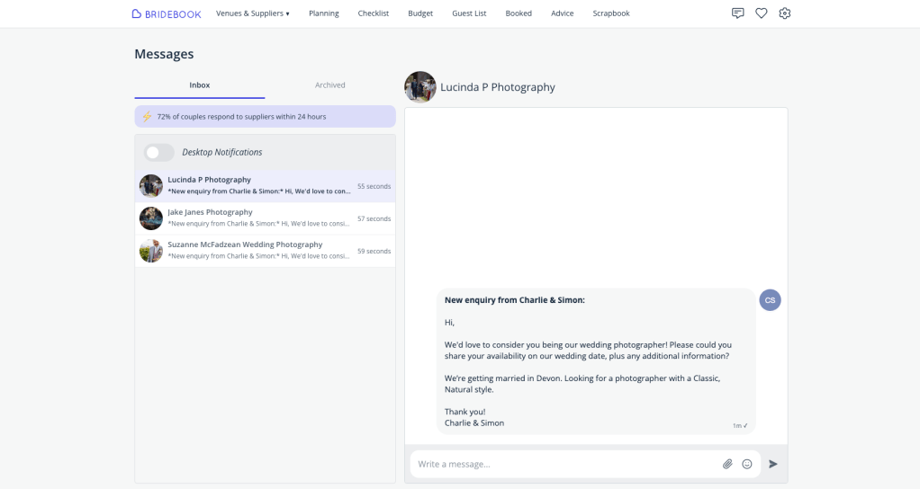 Bridebook’s messaging system is genius. No more wedding spam clogging up your inbox—everything stays in one tidy place. Pre-drafted inquiries save you the trouble of figuring out what to ask, and notifications keep you on top of replies. They even have a “your turn” feature, which is like having a polite friend remind you to follow up.