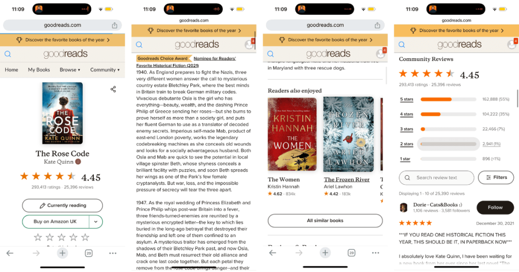 - Next-Level Recommendations: Goodreads knows me. Based on what I’ve read (and loved), it serves up books that match my vibe. Today, it pointed me to The Rose Code, a historical fiction with a thrilling storyline, secrets, and a chance to learn something new about a fascinating era. Add in strong female leads and I’m sold.